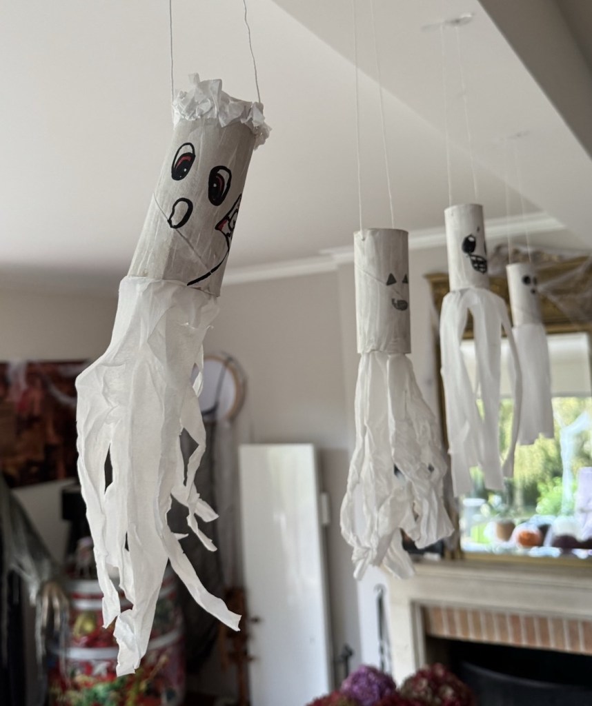 Un bricolage zéro déchet, facile et amusant : transformez des rouleaux de papier toilette vides en petits fantômes flottants.
