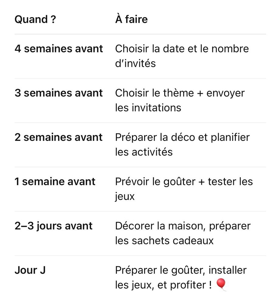 Dans cet article, je vous guide pas à pas pour organiser une fête d’anniversaire à la maison, du choix de la date jusqu’au jour J. Vous y trouverez des idées d’activités et de jeux, des conseils pour la déco et le goûter, ainsi qu’un planning clair pour ne rien oublier. De quoi préparer une fête réussie et créer des souvenirs inoubliables!